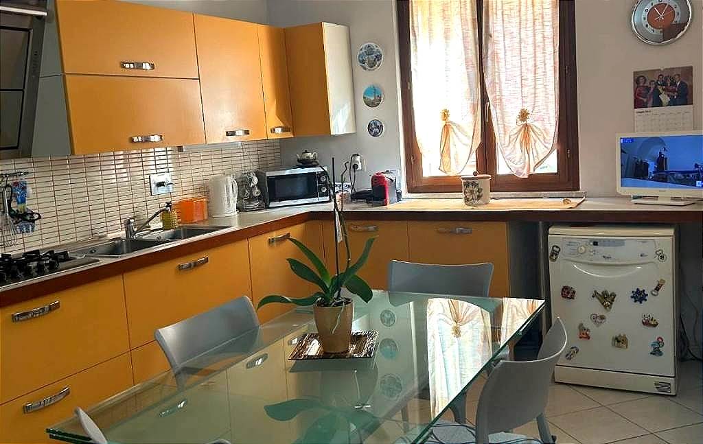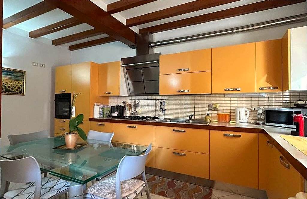 L’abitazione si apre al piano terra con una grande cucina abitabile e un bagno di servizio.